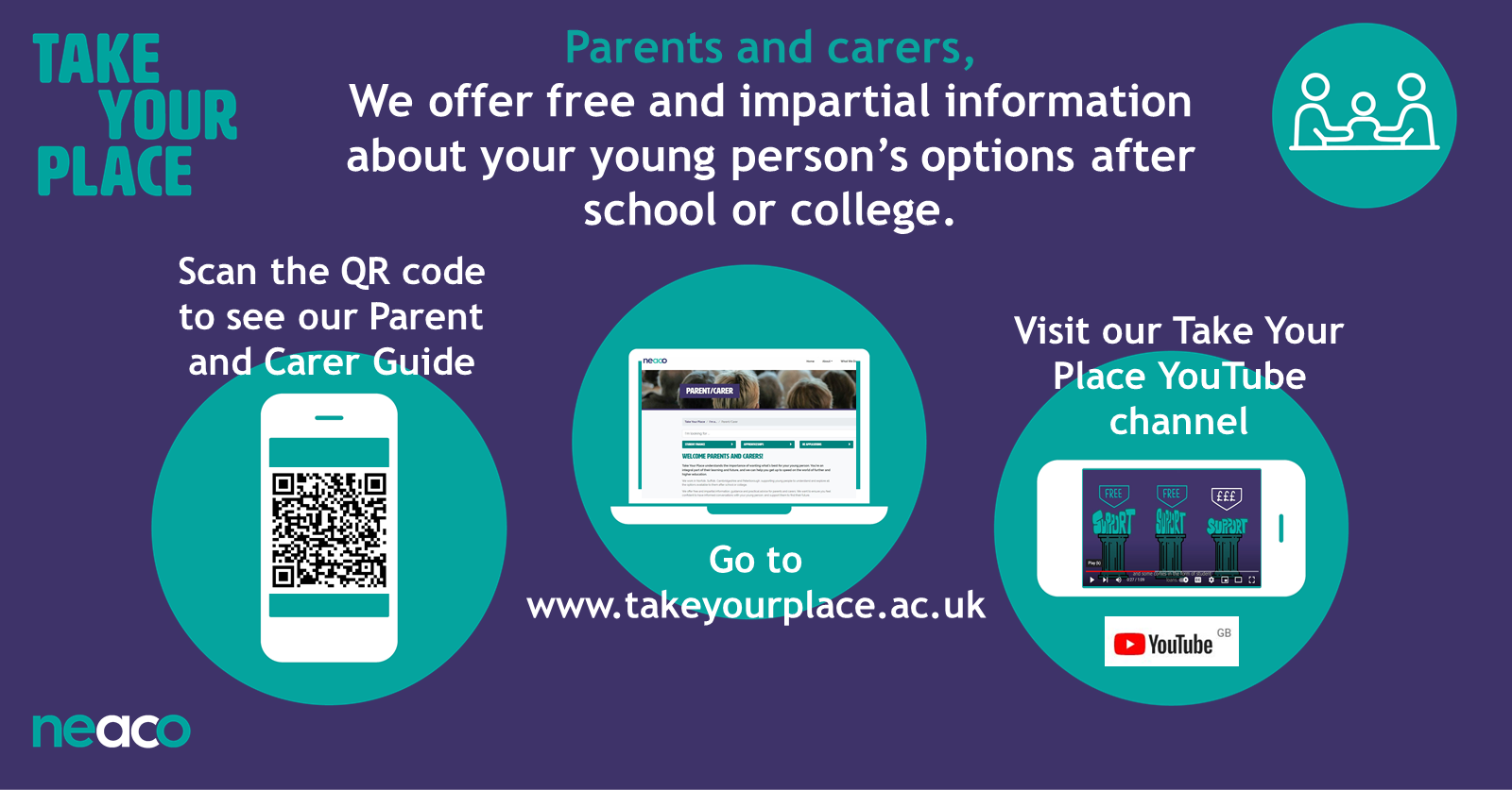 With a NEW Parent and Carer webpage, animated videos, and a ‘low down’ guide to higher education, they’re here to support you to develop your knowledge and understanding too. Keep a look out for posts from Take Your Place social media accounts over the next few weeks and check out the website for useful resources, information and support.