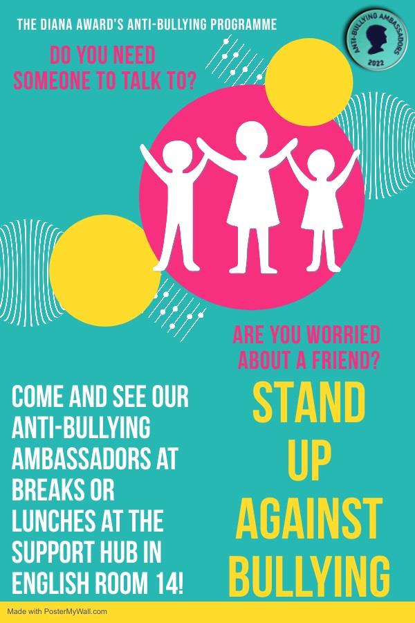 We are proud to have trained ten of our pupils to be Anti-bullying Ambassadors, who run a Support Hub every break and lunch in English Room 14.